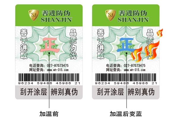 在防偽檢測方面最為簡單、最易操作的納米級材料防偽;鑒別時只需標識上溫度達到(如:打火機考圖案部位),圖案即消失或變色,溫度恢復后,圖案自然恢復,具有可逆性,是國內先進的防偽技術。